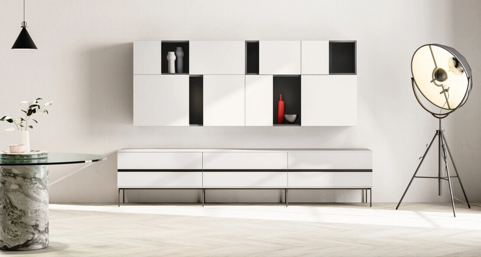 Se vuoi ultimare un soggiorno dinamico e operativo dalle linee moderne, ecco a te la parete attrezzata SpaceMakers day Grip Zalf.